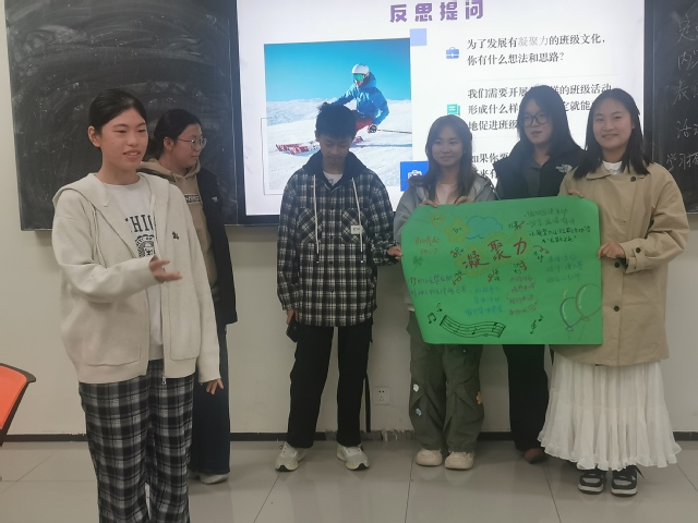 班会伊始,赵老师抛出“什么是班级凝聚力”这一话题。两位同学以“出门忘带钥匙被室友‘远程救援’”“找不到讲座地点同学开视频导航”两件小事迅速激活现场。随后,赵老师做示范访谈,全班分成5个小组,轮流讲述“我亲历的凝聚力瞬间”,并把班级凝聚力的定义、内容、行为表现、行动计划等关键词写在彩色卡纸上。经过同类合并,黑板上出现了班级同学一致认可的“凝聚力公式”:班级凝聚力=主动+互助+责任+归属感。现场遴选5名同学为“凝聚力观察员”,每天记录团建、宿舍演唱会、群相册、运动会、作业互帮互助,共建班级记忆。在“我的凝聚力行为计划”环节,同学们埋头写下自己的“小目标”:主动打扫宿舍卫生;记录同学优点并写一张“夸夸条”……活动最后,辅导员章洁老师希望同学们“把理解融入日常,把包容写进习惯,让32颗心同频跳动,朝着‘行知先进班集体’全力奔跑。”