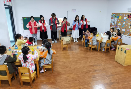 桑园蒲幼儿班是典型的农村幼儿园。大家来到幼儿园后,首先与这里的老师们交流,了解幼儿园的班级、课程与教学等方面的情况,并向幼儿园赠送了儿童绘本。随后,志愿者走进班级,围绕社会主义核心价值观中的“文明”“和谐”“诚信”等元素为孩子们带来了丰富多彩的课程活动。志愿者通过编顺口溜、开展垃圾分类投壶小游戏等活泼生动的形式,在互动游戏中让小朋友们快速地掌握了垃圾分类的方法,教育孩子们要爱护生态环境,保卫地球家园;将中国传统典故“曾子杀猪”的故事进行情景演绎,教育小朋友做人要言而有信,诚实待人;通过组织小朋友在纸盘上绘画,号召大家节约粮食,好好吃饭,积极参加“光盘行动”。教室里,孩子们积极与志愿者互动交流,欢笑声此起彼伏,现场气氛活跃。