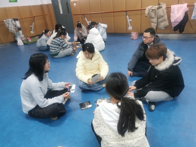 班会伊始,全班分为四组。每位同学先抽取一张能代表自己大学适应期烦恼的照片卡:有人举着“沙漠里的石头”坦言学业焦虑,有人握着“孤独的长椅”倾诉远离家乡的失落。随后,同组伙伴再为对方挑选一张“解忧卡”——或是一株“向日葵”,附上一句“每天给你带一句阳光语录”;或是一份治愈系美食照片,约定“下课一起打卡”。在组长访谈环节,烦恼者被温柔追问:“如果情绪再次来袭,你希望在什么时间、什么地点、第一时间找到谁倾诉?”三轮头脑风暴后,四组不约而同地将朋辈互助写进班级公约。当童谣“老狼老狼几点了”的旋律响起,舞蹈房瞬间变身童年乐园。最欢乐的“丢手绢”环节被赋予新规则:被抓住的同学无需表演节目,而是要完成一项“卫生打扫任务”,笑声与跑步声交织,焦虑随汗水蒸发。活动尾声,辅导员章洁老师为大家送上“暖心”叮嘱:“劳逸结合,认真复习,打赢大学第一场期末战役!”班长刘冰倩总结:“今天我们不仅交换了故事,更交换了继续前行的勇气。”