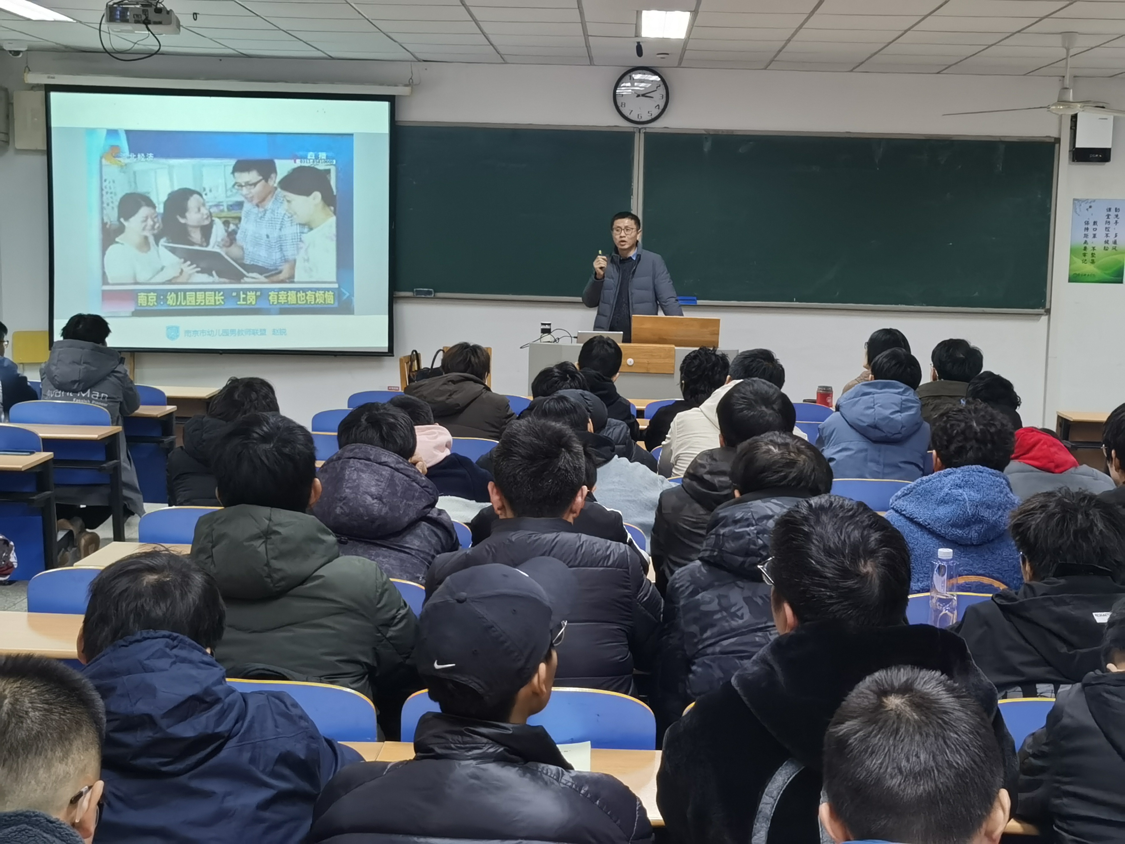为帮助广大男生树立专业认同,做好职业发展规划,22日下午,我院在行知组团E101教室举行男幼师职业发展讲座。南京市男幼师联盟负责人、南京市佳营幼儿园园长赵锐受邀来到学院,为学生带来“少有人走的路——谈谈幼儿园男教师的职业发展”专题讲座。讲座由党总支杭梅书记主持,学院18级——20级男生共99人参加了本次活动。