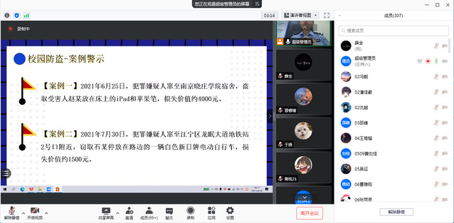 为提高新生的安全防范意识和自我保护能力,杜绝校园安全事故的发生,14日下午,学院携手保卫处,邀请江宁高新区派出所社区中队长李琳警官通过线上、线下相结合的方式为我院2021级新生做了“开学第一课——新生安全防范暨法制教育”专题讲座。学院新生、老生400余人进入直播间参加了讲座。