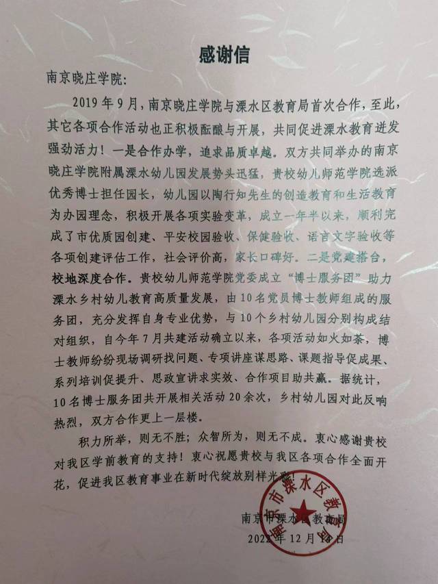 近日,南京市溧水区教育局发来感谢信,对我校在深化合作办学、党建共促和服务地方学前教育方面做出的贡献表示衷心的感谢。